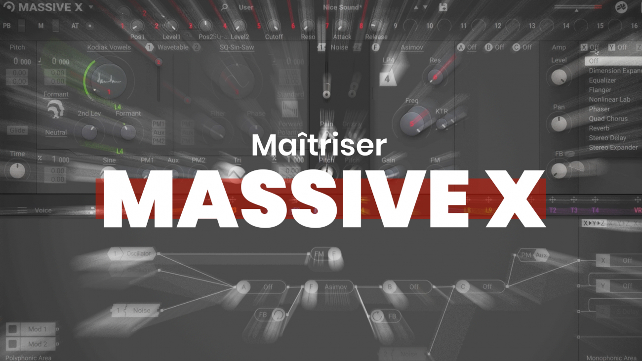 Nous faisons un setup audio et midi, et apprenons à nous servir du routing interne. Nous pouvons commencer rapidement à programmer des sons à l’aide des banques de wavetable proposées par Massive X, à les sculpter à l’aide des filtres, et des insert effects, nous utilisons les enveloppes, les modulations, les FLO et les différents performers pour faire vivre les sons. Enfin, nous plaçons les effets audio pour donner une dimension, une profondeur et une largeur sonore supplémentaire au son.