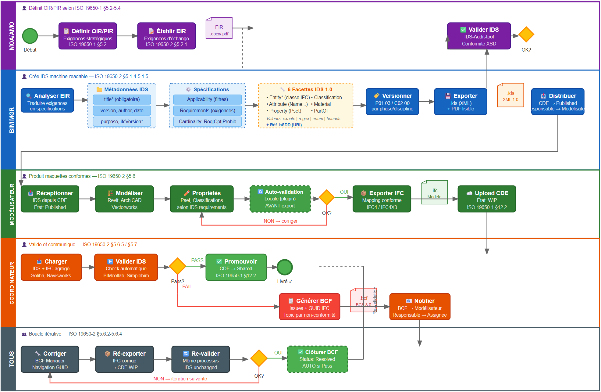 - L'IDS (Information Delivery Specification) : un standard buildingSMART qui définit de manière informatique (XML) ce qui est attendu dans le fichier.