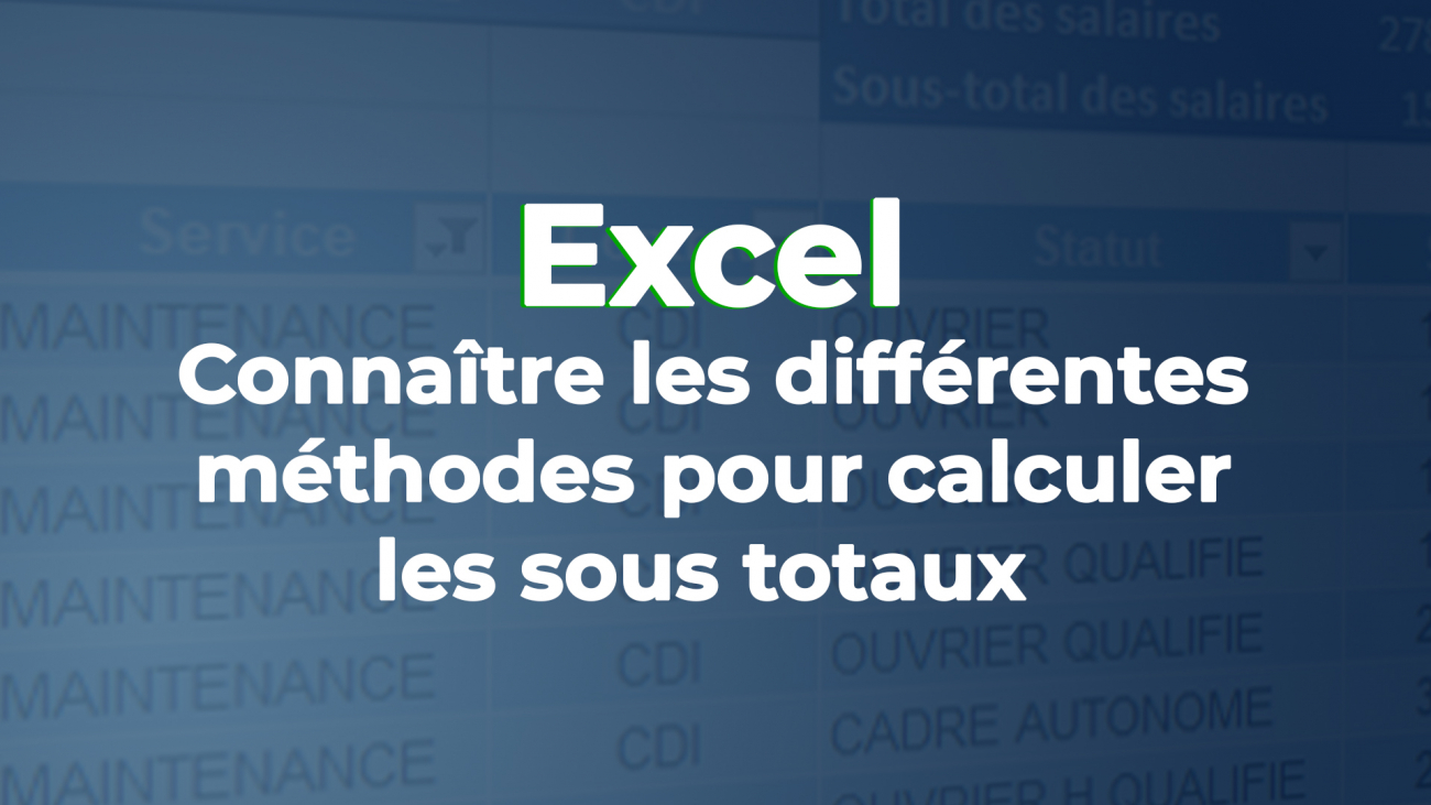 Ce tuto Excel en vidéo développe les différentes méthodes pour générer des sous-totaux : la fonction SOUS.TOTAL, les fonctions SOMME.SI.ENS, MOYENNE.SI.ENS... ou encore en utilisant l'outil sous-total.